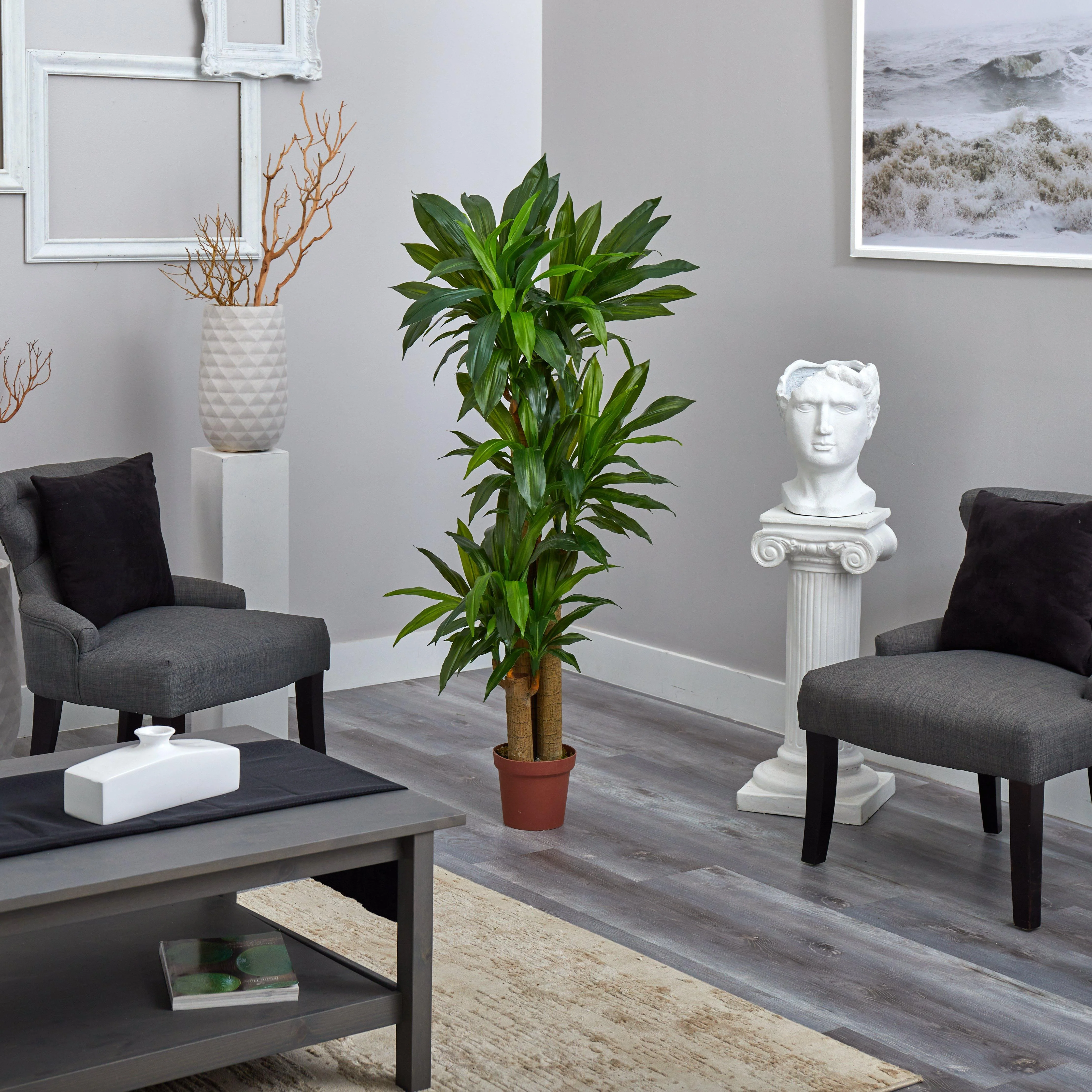 The simple elegance of our Corn Stalk Dracaena silk plant is now yours without ever needing to worry about watering or upkeep. Tall, thick, long stalks overlap each other to create multiple levels of beauty as they cascade out in a fountain of green. Those desiring a closer look will be rewarded with views of light patterns against dark green and real to the touch foliage and stalks.