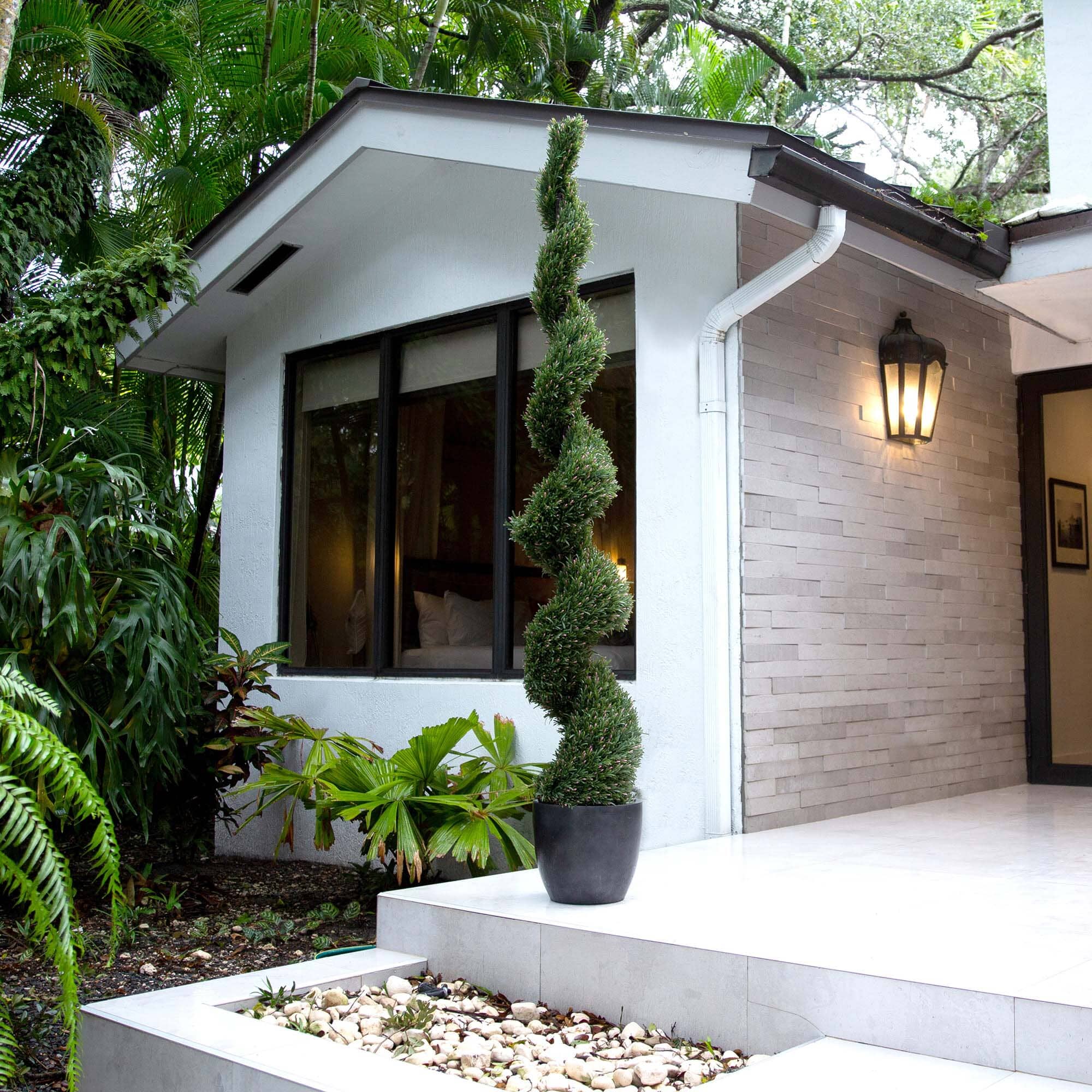 Decorate your space with the timeless elegance of our Artificial Rosemary Spiral Tree, a testament to nature's best. This UV-resistant silhouette stands tall, offering the lush allure of rosemary without any of the upkeep associated with gardening. Inspired by nature, its gracefully spiraled shape serves as a captivating visual statement in both indoor and outdoor settings, you'll notice the attention to detail throughout. At an impressive height of 9' and nestled in a classic nursery planter, this tree promises to remain verdant and vibrant throughout the seasons, effortlessly transitioning from the cozy ambiance of winter to sunny, bright summer. Place it on your porch for an instant touch of sophistication that says "welcome" all year round.